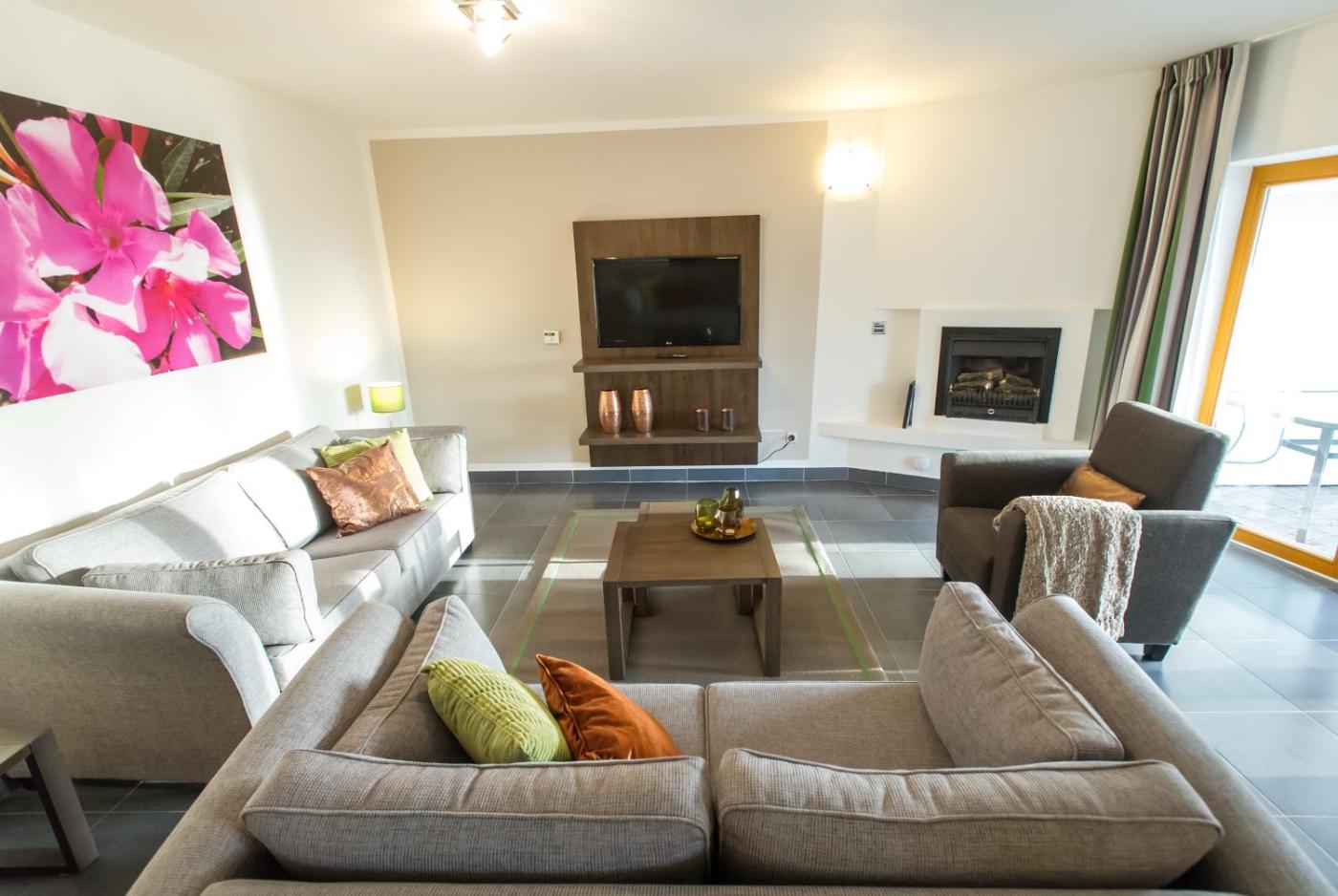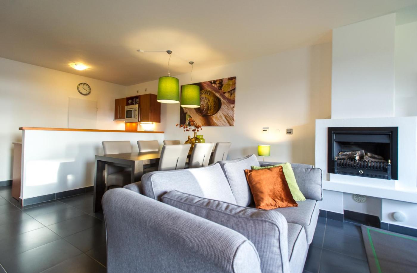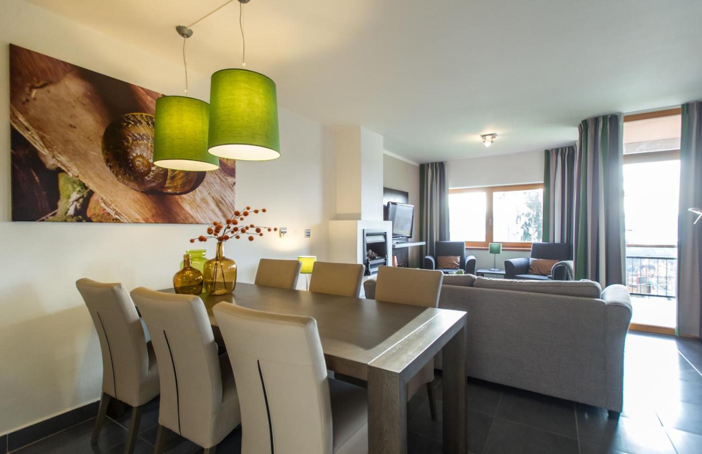 Each spacious apartment at Lipno Lake Resort comes with a modern, well-equipped kitchen and heated floors. The seating area has plush couches and a flat-screen satellite TV.