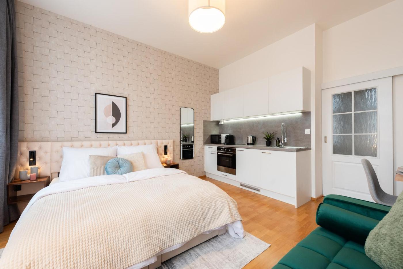 Queen Studio. The studio has a private bathroom, a washing machine, soundproof walls, as well as a seating area with a flat-screen TV. Guests can make meals in the kitchen that features a stovetop, a refrigerator, an oven and a microwave. The studio features a TV, a tea and coffee maker, a wardrobe, a sofa as well as city views. The unit has 2 beds.